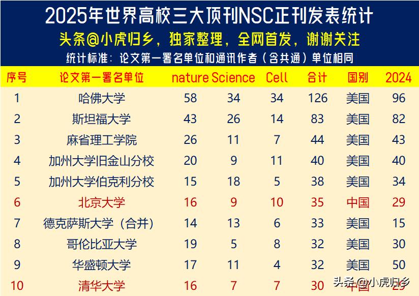 图 2025年最后一期NSC封面 统计说明:(1)国家发表情况只统计论文第一署名单位为该国的论文。高校发表只统计论文第一单位和通讯作者(含共同通讯作者)单位相同的论文。 (2)中国论文统计中,包括CNS所有已经出刊论文和在线发表但还未出刊的论文。 (3)国外论文统计中,nature统计标准和中国一致,但Science和Cell只统计出刊论文,少量在线发表但未出刊的的论文未统计在内。 一、世界高校前10名其中,美国高校8所,中国高校2所。十所高校NSC正刊发表总数均超过30篇。 哈佛大学、斯坦福大学、麻省理工大学位居世界高校前三。 北京大学和清华大学进入世界前十,取得历史最好成绩。