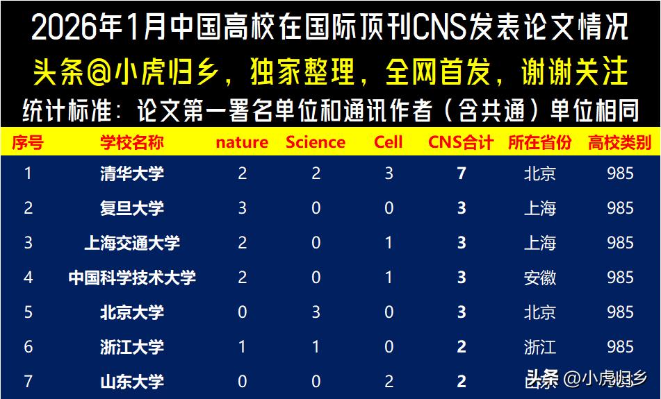 1 c# f0 N1 ~2 I: u& p& z中国科学院合计发表12篇,占比21%,位居全球科研院所第一,其中物理所表现突出,贡献3篇。 其他单位合计发表5篇,占比9%。新型研发机构亦崭露头角。深圳湾实验室、苏州实验室、甬江实验室、北京智源人工智能研究院及华大基因各发表1篇,显示我国科技创新体系持续完善,多方力量正共同推动科学前沿突破。 一、发表2篇及以上高校情况清华大学以7篇位居第一。北大、科大、上交、复旦以3篇并居第二。浙大和山大各发表2篇。